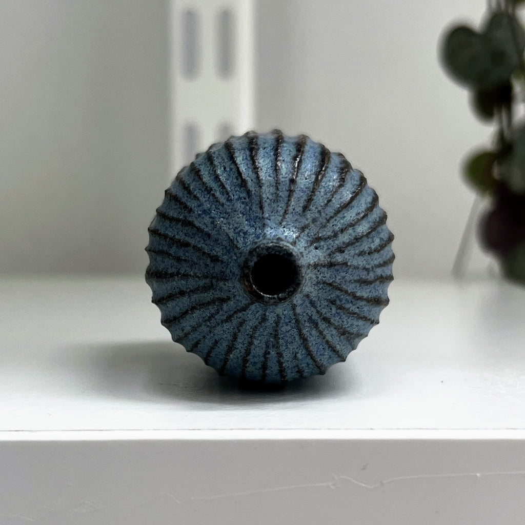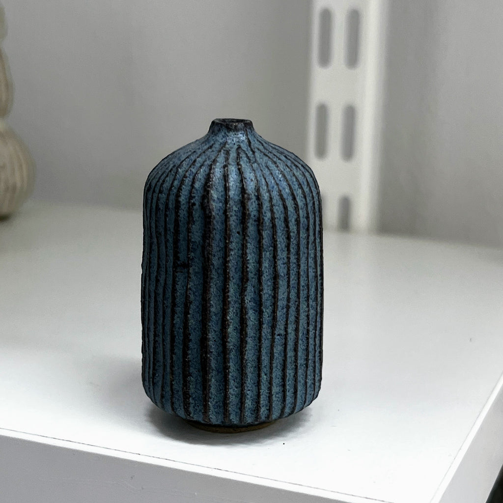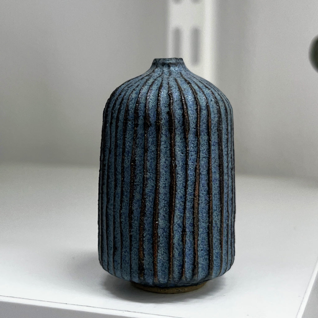 matt blue glaze on fluted stoneware clay
